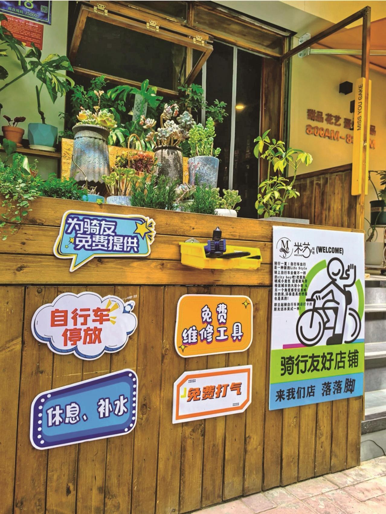 围绕骑行的配套服务也在同步完善。银川市分布着众多自行车租赁点,按小时或天数计费,方便偶尔想体验骑行的市民。此外,骑行主题咖啡馆、餐厅等也应运而生,为骑行者提供休憩交流的场所,逐渐形成了独特的骑行社群文化。位于兴庆区永康南巷的“米苏烘焙”便是一家“骑行友好店铺”,店外骑行主题的布景洋溢着自由气息。店主本人是骑行爱好者,为结交朋友、打造贴心“骑行驿站”,店铺推出活动:骑自行车到店打卡可获赠冰美式一杯,并免费使用维修工具和打气服务。