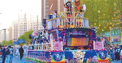 另一边,刘师傅又将新乘客送到了城北区西海路的豹街。与大新街夜市等老牌夜市街区不同,豹街是西宁市近年来重点打造的新潮夜市街区。今年上半年,城北区围绕“雪豹”主题IP,在豹街新增10处雪豹红绿灯、63处雪豹元素喷绘地画,还在3处楼梯设置投影,打造沉浸式光影秀。雪域精灵的相关元素,融进了豹街的街头巷尾。花车巡游活动上,雪豹人偶向路边的游客挥手致意,花车侧面绘有察尔汗盐湖的全景图,更有蒙古族“好汉三艺”、现代舞《西宁北》等节目热闹上演。