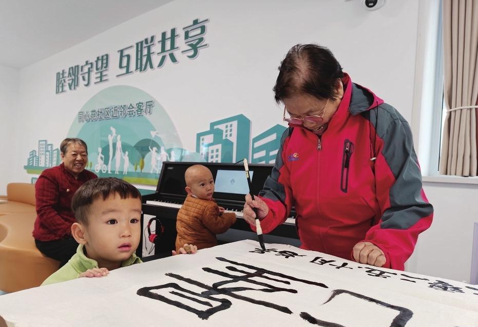为给老人和儿童创造更多互动、交流与共享的机会,让老人能“看得见孩子,放得下心”,景墨社区经过综合考量,重新规划社区空间,将儿童之家和书画室相邻设置,并配备志愿者守护儿童安全。这让老人们从“24小时照护员”的角色里暂时抽离,重新捡起了被搁置的爱好,也找回了久违的“自在”。