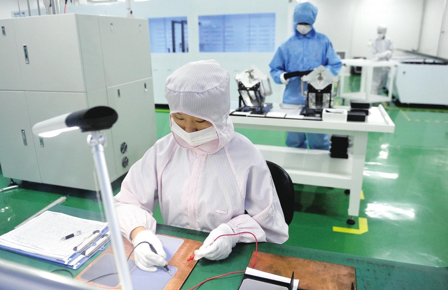 宁夏银星能源股份有限公司的工人在光伏电池工厂内工作