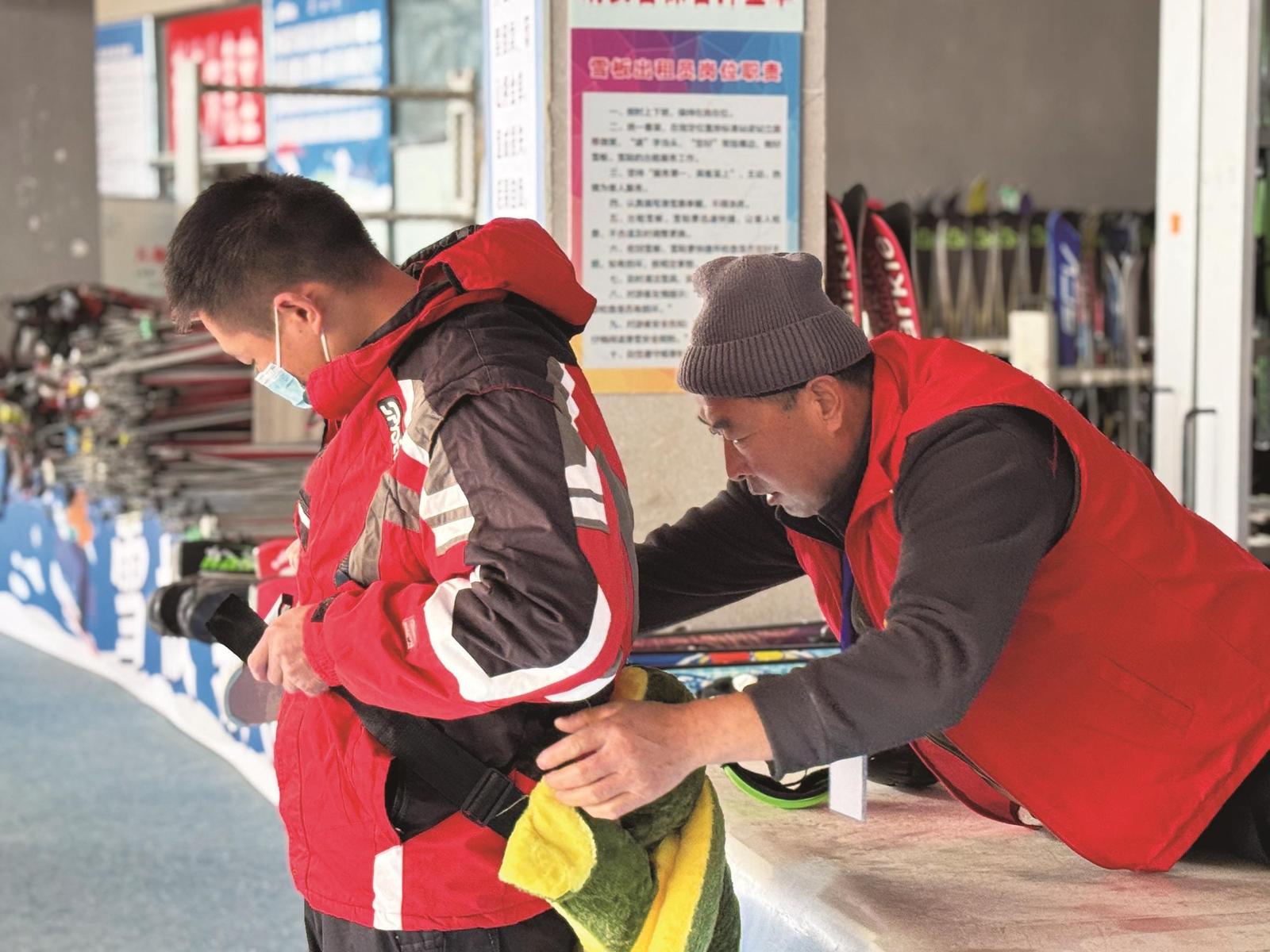 在阅海滑雪场,工作人员为滑雪爱好者佩戴护具