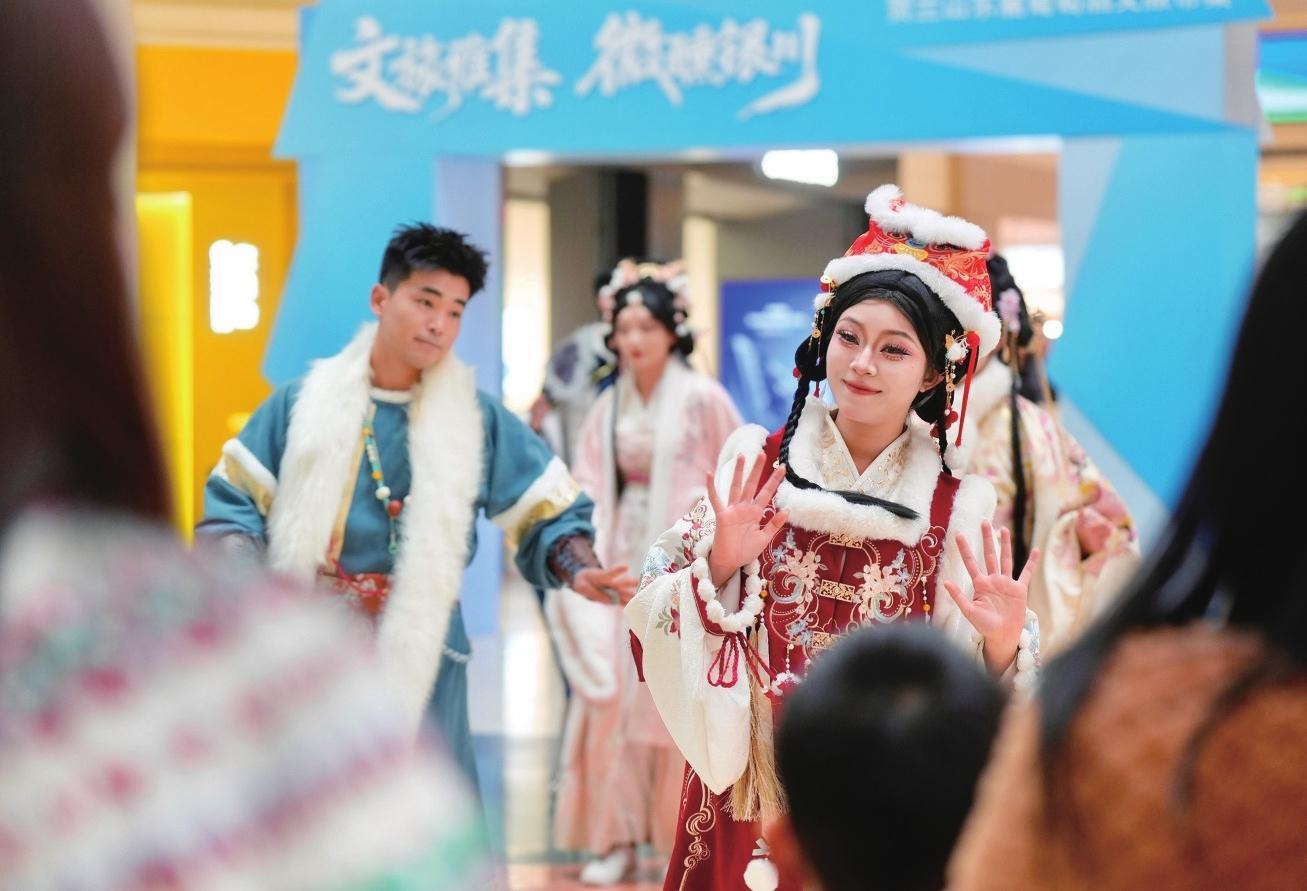 在金凤区一商场内,来自漫葡·看见贺兰沉浸式演艺小镇的演员与市民互动