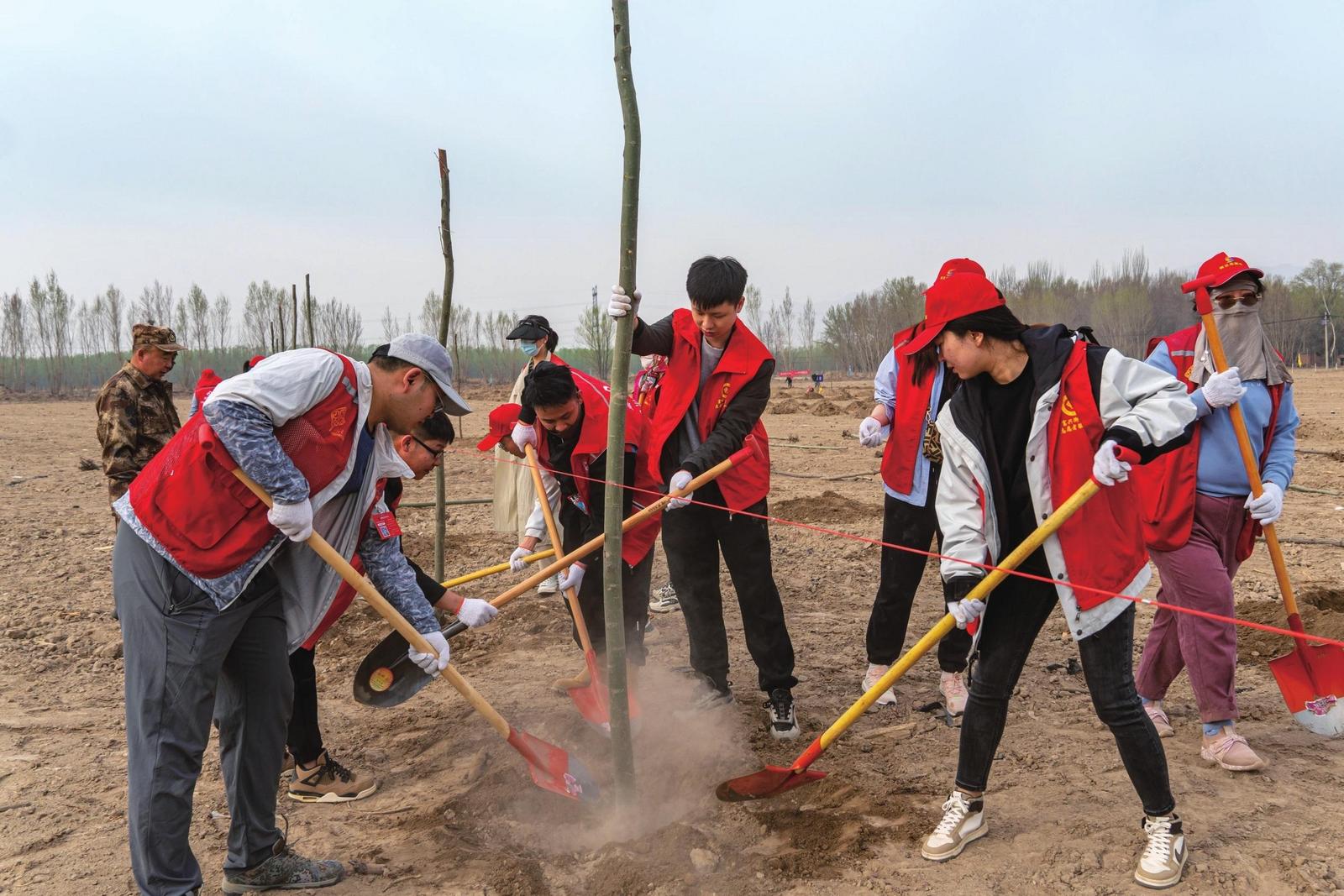 志愿者合作植树