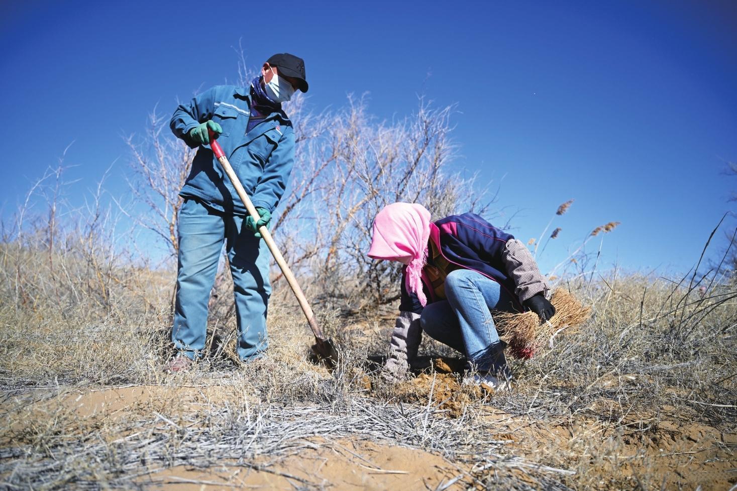 林场工人栽植柠条防沙固沙