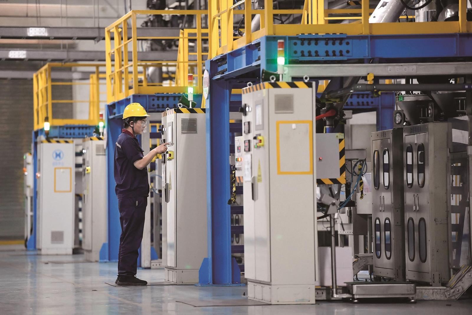 在宁夏汉尧富锂科技有限公司生产车间,工作人员正在监控自动装钵机运行