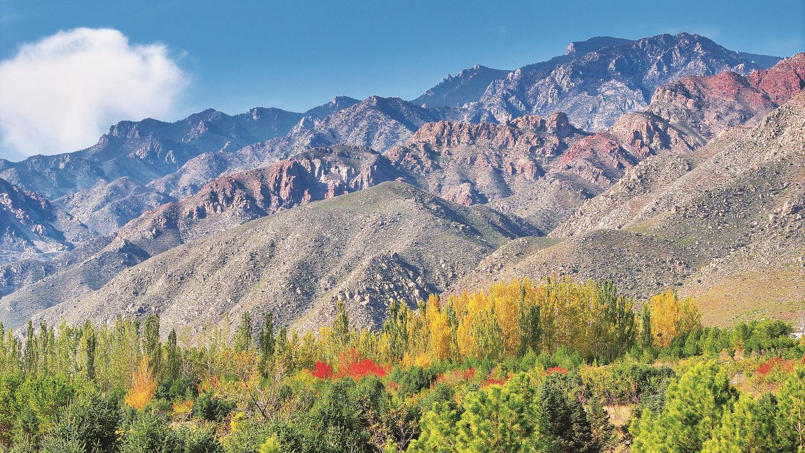 贺兰山秋色渐浓,山下层林尽染、五彩斑斓