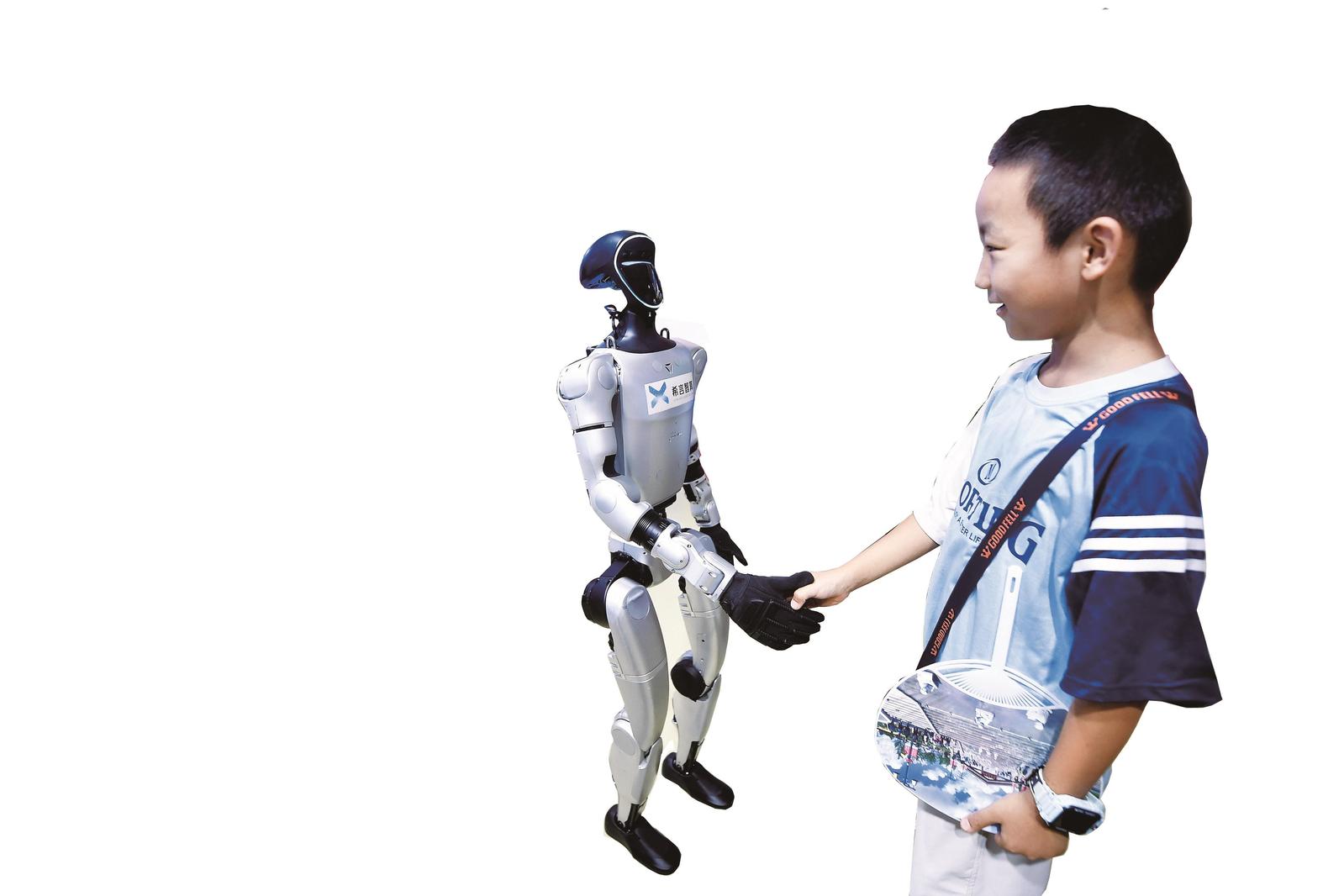 在第七届中阿博览会上,小朋友与机器人握手(8月30日摄)