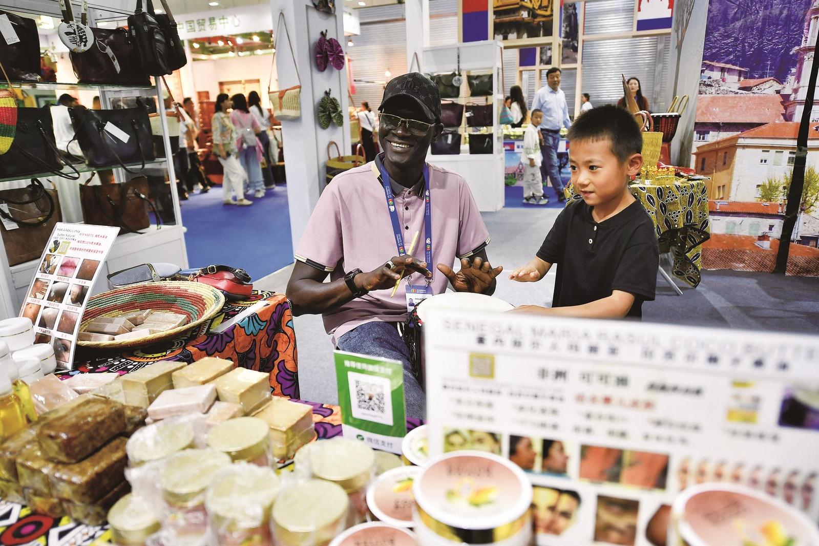 在第七届中阿博览会上,孩子与商户互动(8月30日摄)