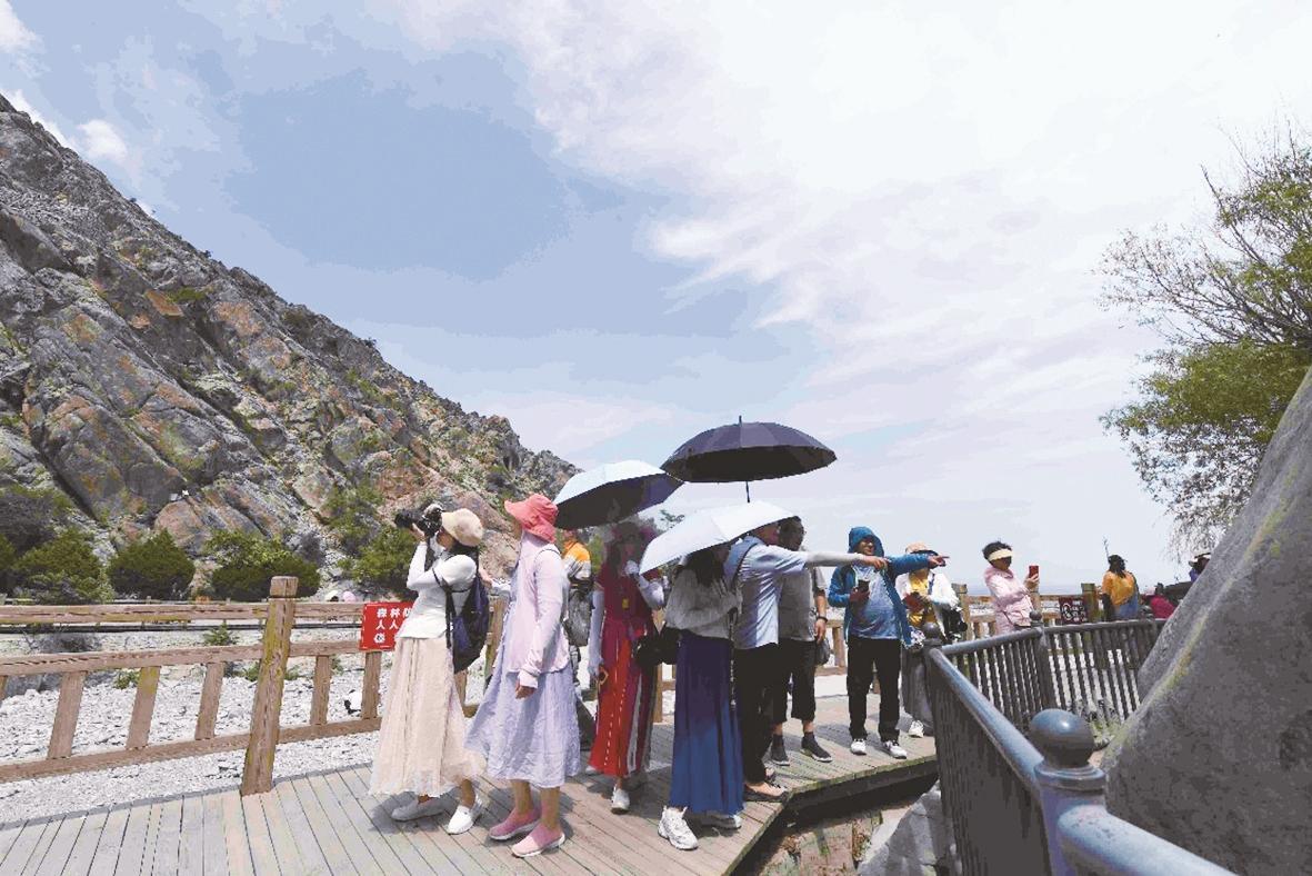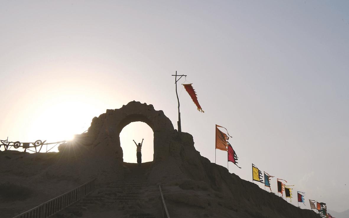 游客在镇北堡西部影城“月亮门”拍照打卡