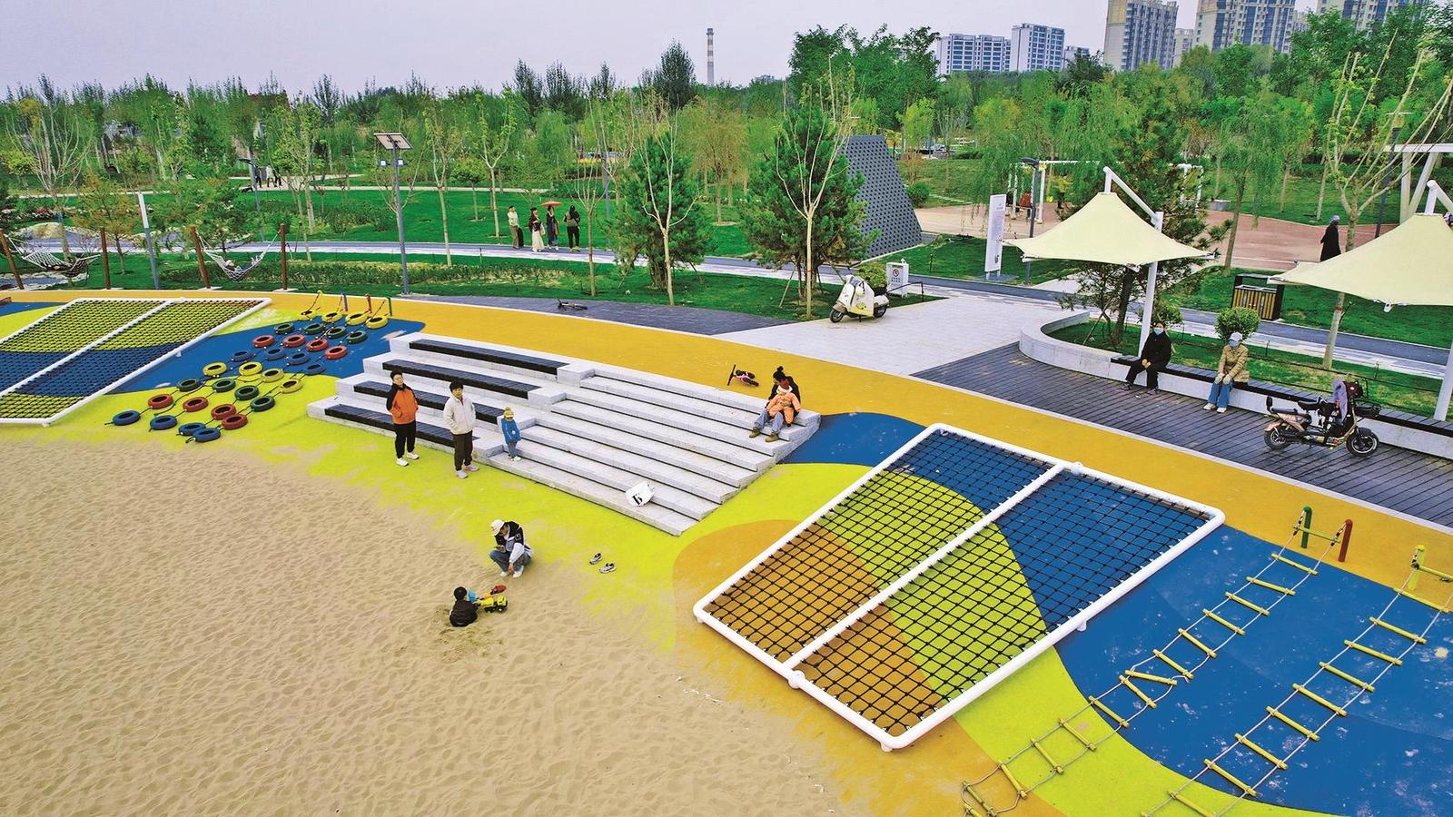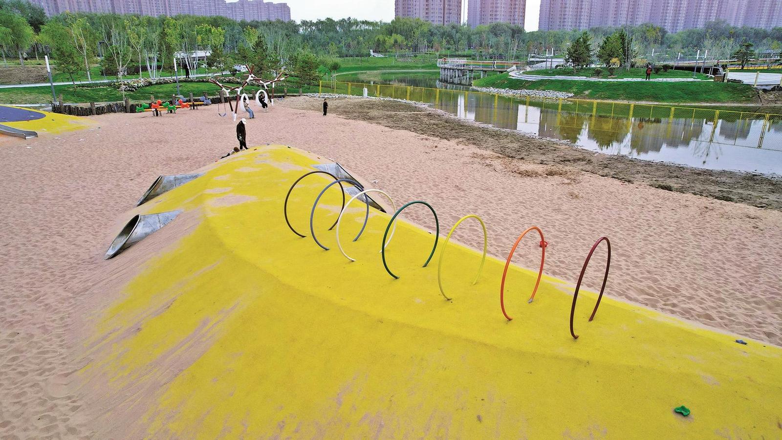 大碱湖海绵湿地生态公园以“松涛观荷”为主题,种植樟子松、白皮松、青海云杉等常绿植物构建冬季绿谷,湖面培育荷花展现湿地风貌,同时布局沙水乐园、律动公园等多元空间,将修复后的自然景观与生活场景相融合,成为周边居民休闲运动、亲水康养的乐园。