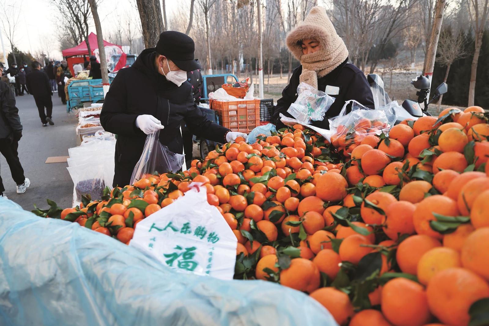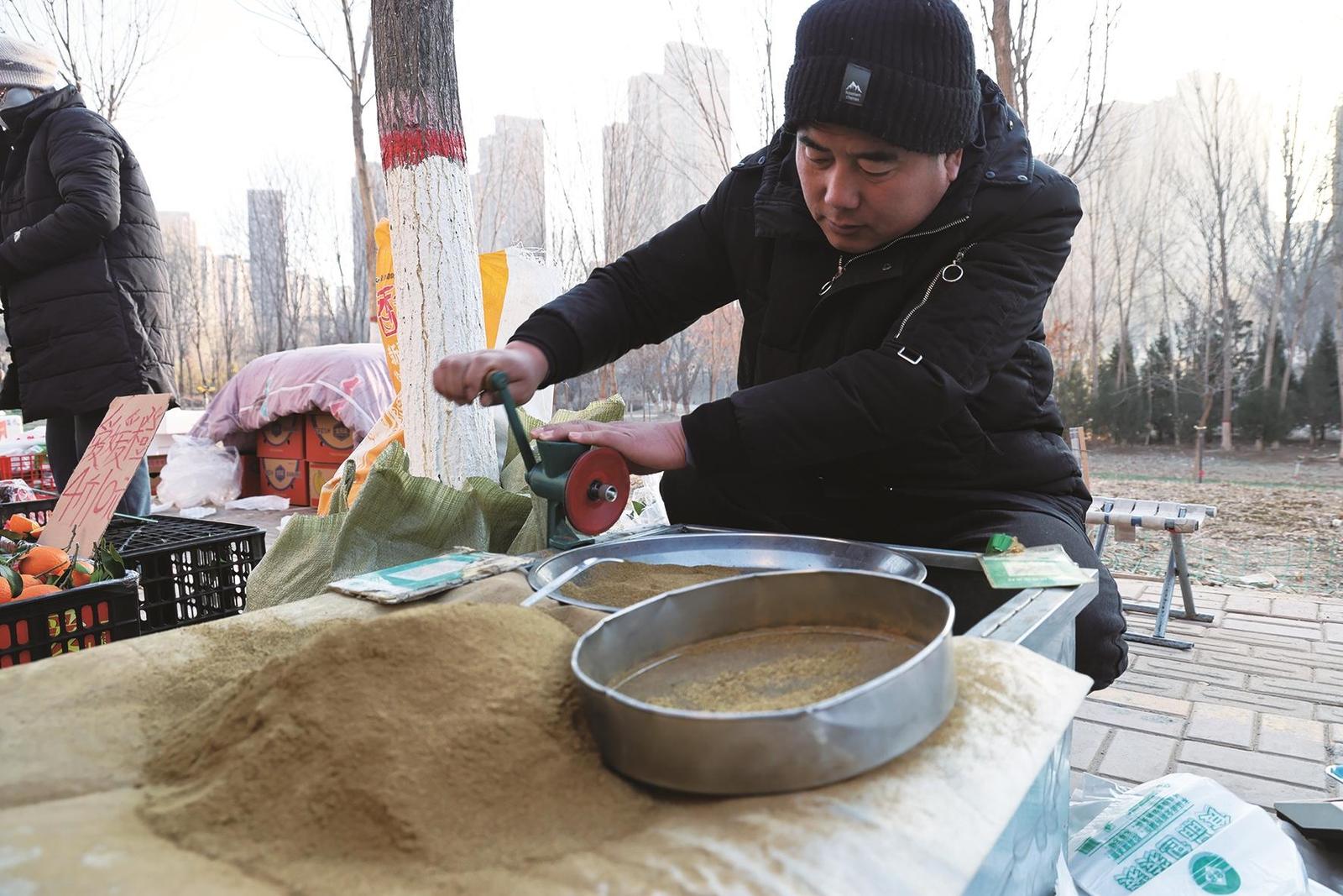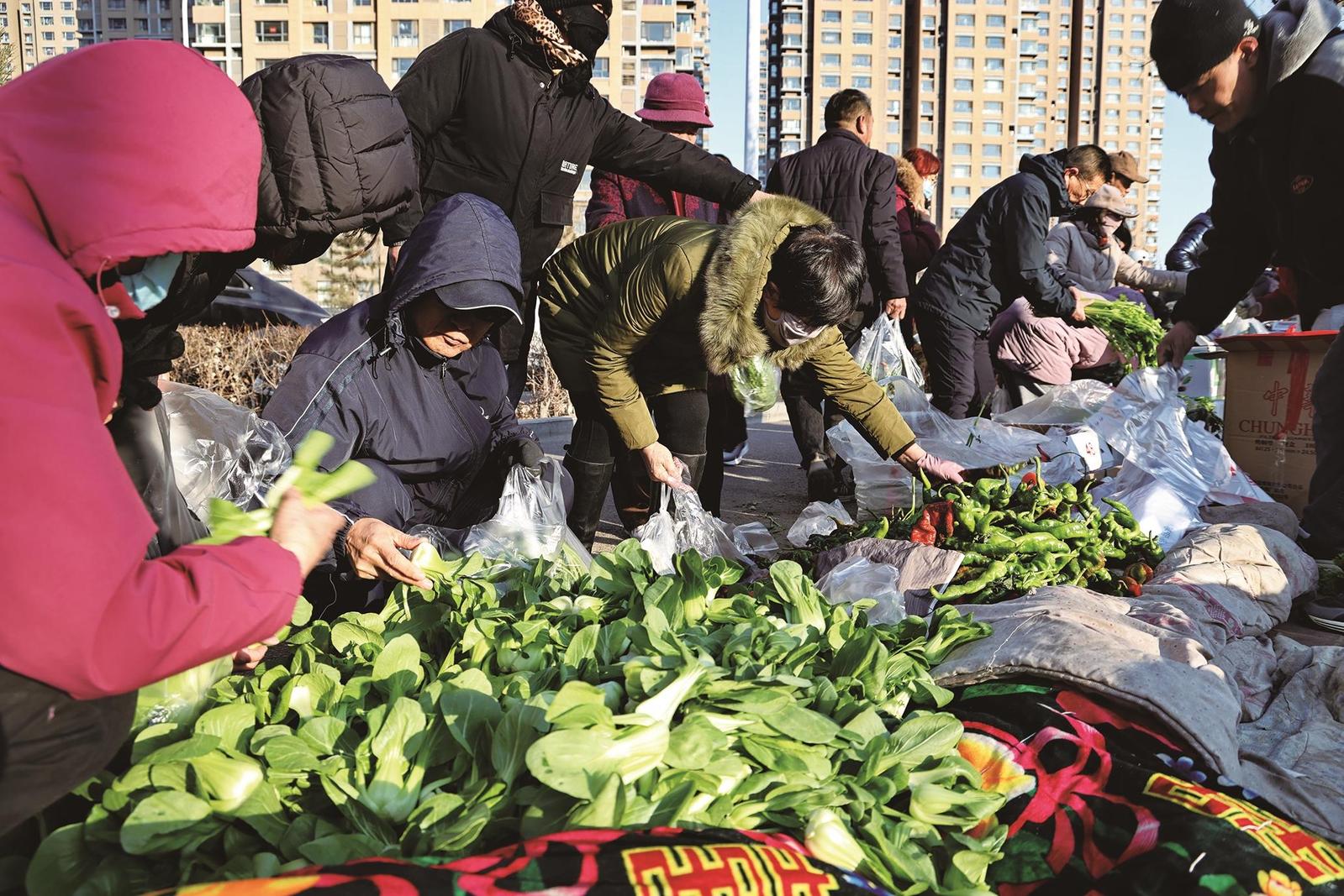 一边,结着霜花的蔬菜与鲜红的苹果相映,挂着晨露的鸡肉在喷灯的炙烤下泛着柔和光泽,冒着热气的新鲜牛奶顺着漏斗流淌进玻璃瓶;人们一边挑选冬储菜一边交流腌制心得,老年人捧着热豆浆站在熟食摊前寒暄,商贩顺手为老主顾多塞一把香菜。另一边,理发师手握推剪在晨光中修剪银发,磨刀匠有节奏地打磨刀具……简单的集市,描绘出充满人情味的生活画卷。
