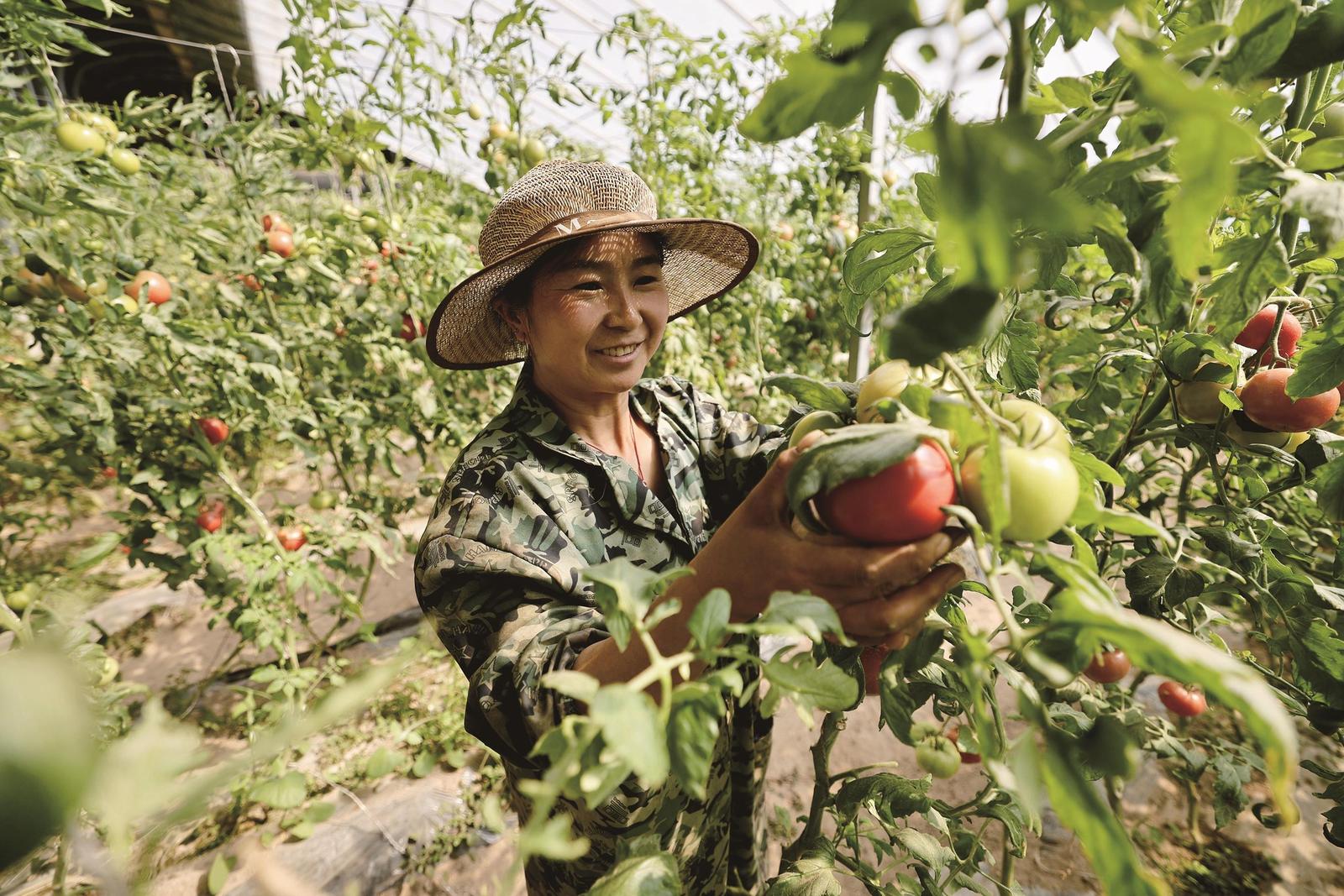温室大棚里,农民正忙着采摘西红柿