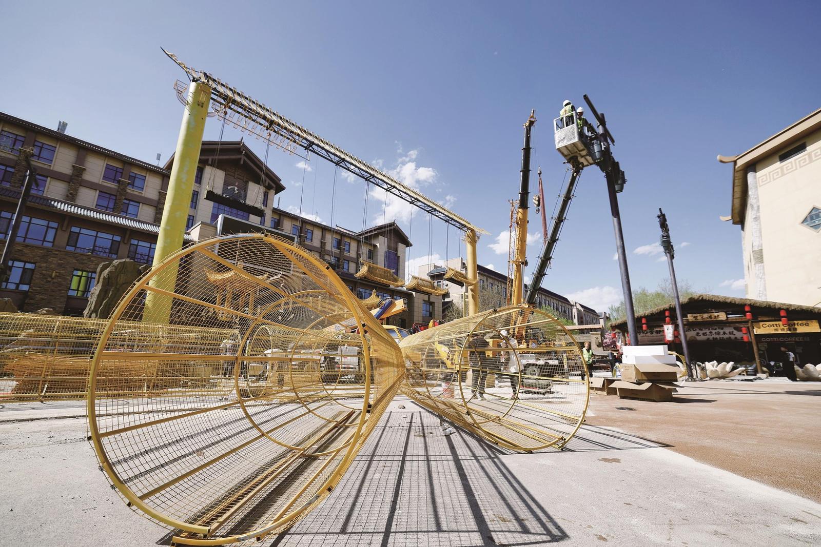 工人们抢抓晴好天气,加紧推进景观、业态及配套设施建设