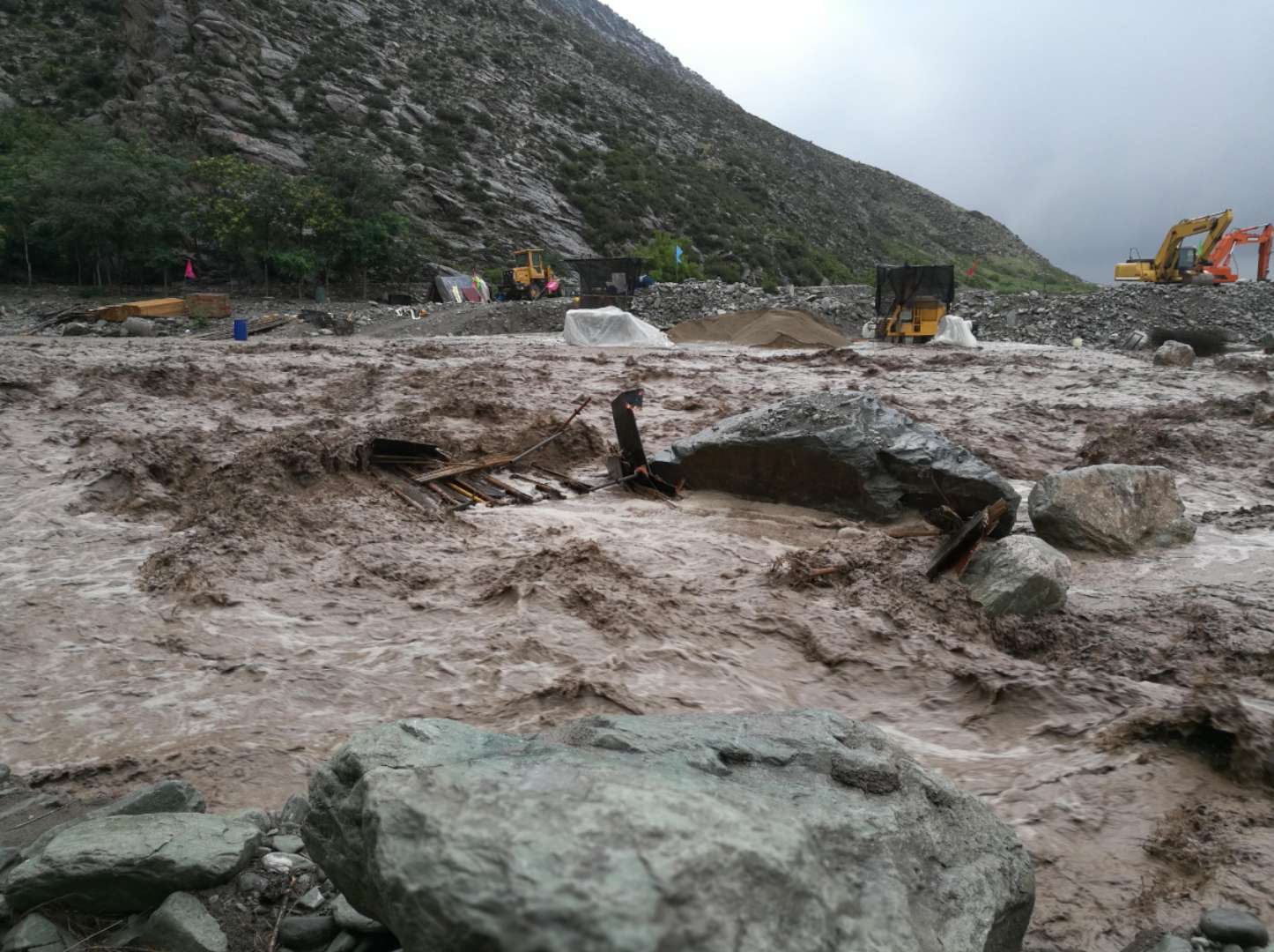 截至下午2:00,岩画景区雨势有所增大,洪水势头未减小,已有排障车辆清理通往岩画景区的道路。