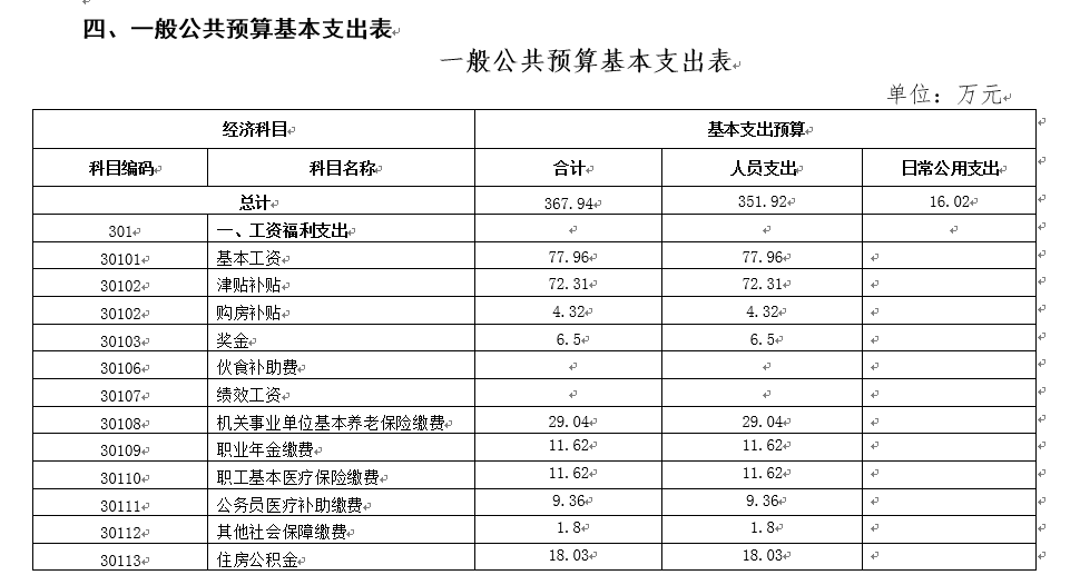 2018年一般公共预算拨款基本支出367.94万元,比2017年执行数据减少41万元,下降 10%。其中: