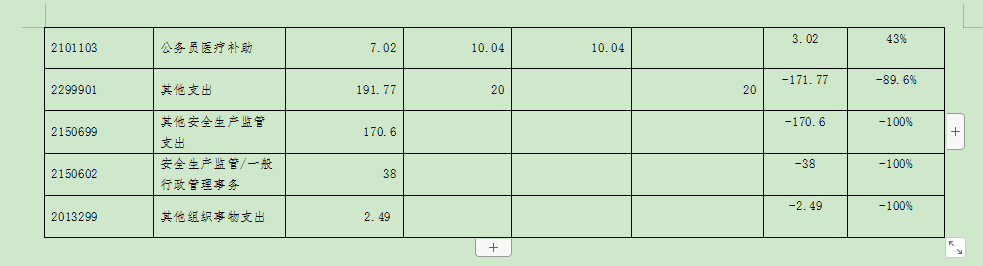 其他支出(2299901)2019年预算20万元,比2018年执行数(决算数)减少171.77万元,下降89.6 %。主要用于支付年度安全生产知识竞赛相关费用。2018年度的专项经费主要从其他支出项目里列支,2019年主款变更后,专项经费主要从安全监管支出,故较2018年下降89.6 %。
