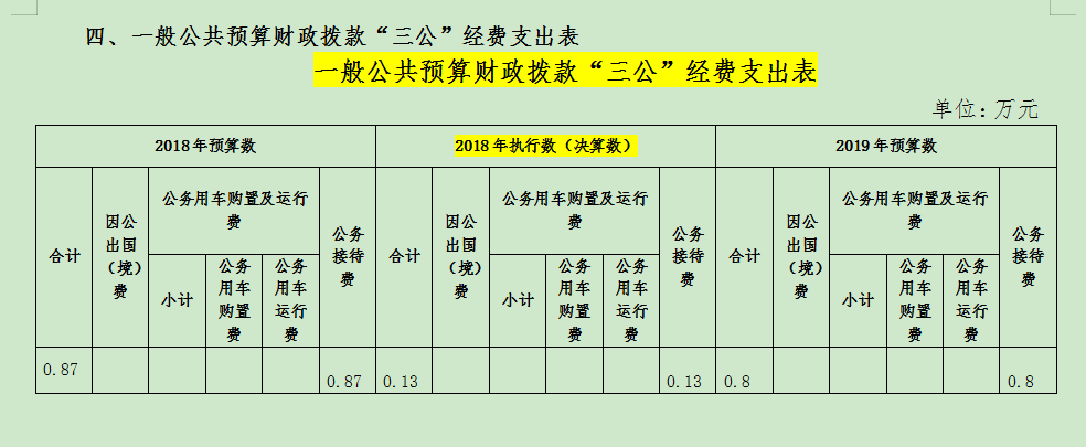 银川市安监局2019年“三公”经费财政拨款预算数为 0.8万元,其中:因公出国(境)费0万元,公务用车购置0万元,公务用车运行费0万元,公务接待费0.8万元。