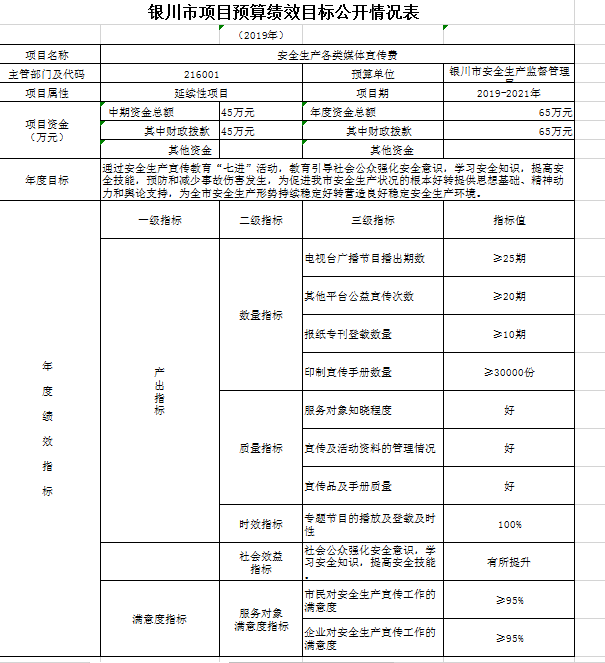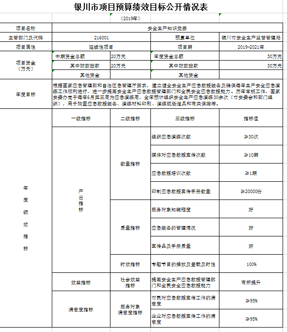 名 称:银川市安监局2019年项目预算绩效目标公开情况表公开表