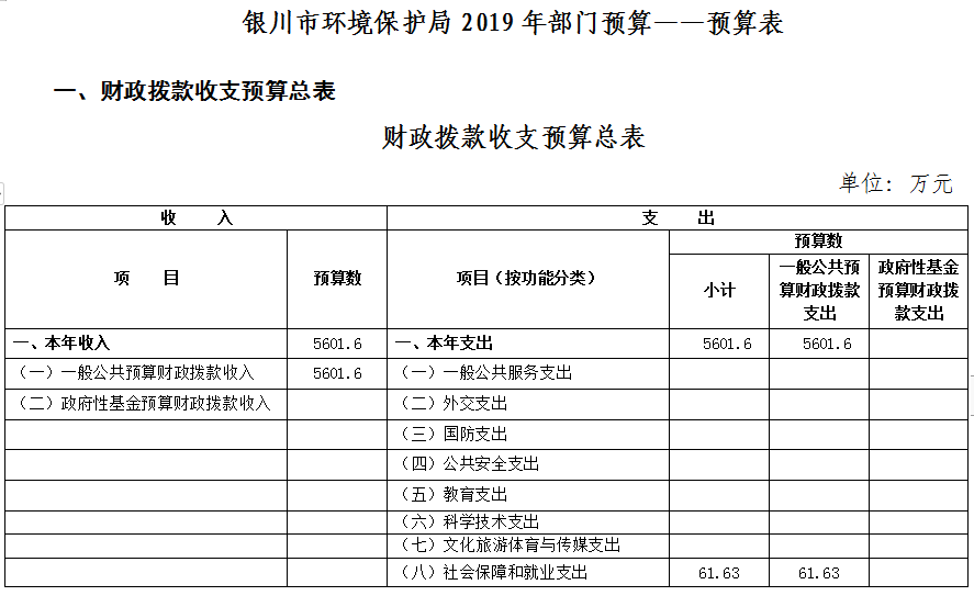 银川市环境保护局2019年收入总预算5601.6万元,其中:本年收入5601.6万元;支出总预算5601.6万元。