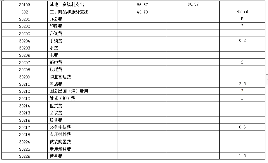 公用经费43.79万元,主要包括:按部门支出经济分类科目分项说明。如,办公费、印刷费、咨询费、手续费、水费、电费、邮电费、取暖费、物业管理费、差旅费、因公出国(境)费、维修(护)费、租赁费、会议费、培训费、公务接待费、专用材料费、劳务费、委托业务费、工会经费、福利费、公务用车运行维护费、其他交通费、其他商品和服务支出、办公设备购置、专用设备购置。