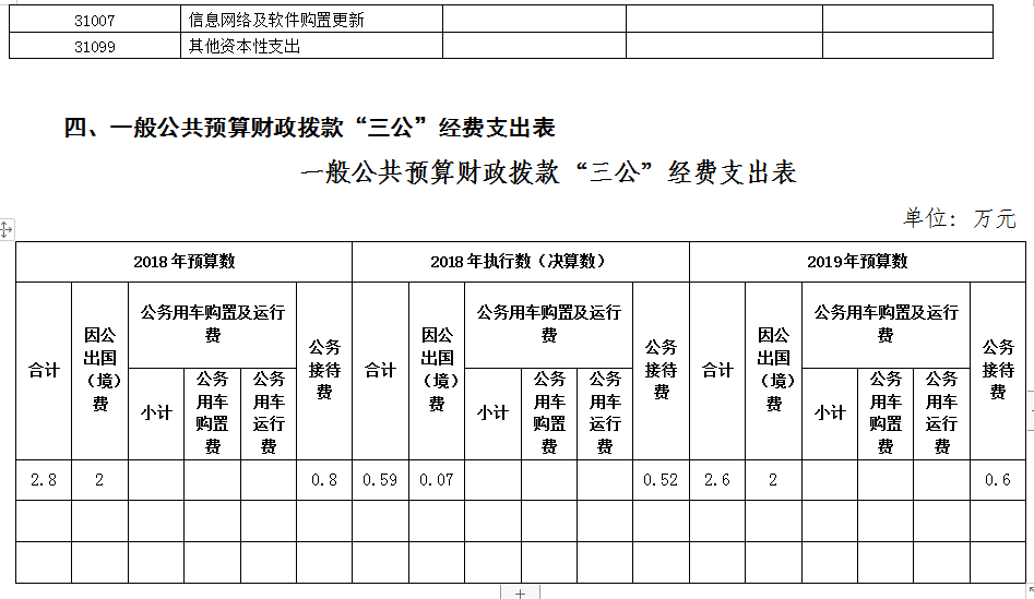 2019年“三公”经费财政拨款预算比2018年预算数减少0.2万元,其中:因公出国(境)费无增减变动;公务用车购置费无增减变动;公务用车运行费无增减变动;公务接待费减少0.2万元,主要原因2018年接待外省单位数量减少。