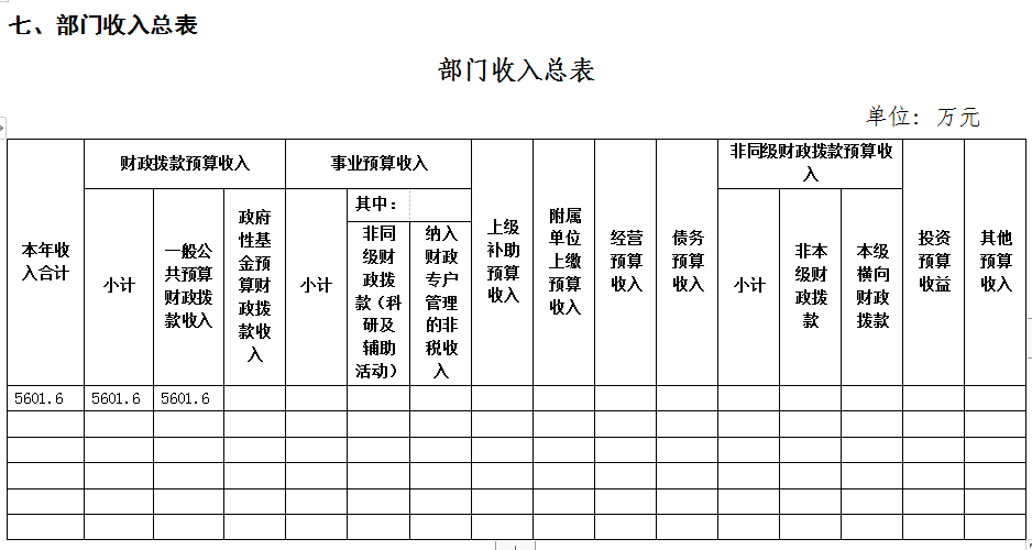 本年收入包括:财政拨款预算收入5601.6万元,占100%;无事业预算收入、无上级补助预算收入、无附属单位上缴预算收入、无经营预算收入、无债务预算收入、无非同级财政拨款预算收入、无投资预算收益、无其他预算收入。