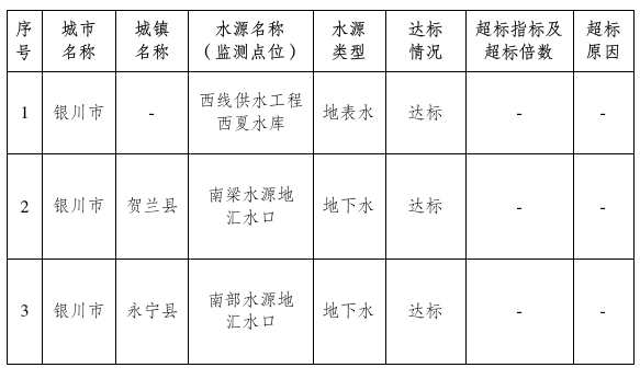 2025年10月,银川市纳入监测的在用城市集中式生活饮用水水源地共3个,其中地表水型水源1个,地下水型水源2个。宁夏回族自治区生态环境监测中心采用采测分离模式对1个地表水型水源,2个地下水型水源进行监测。