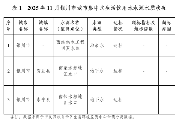 2025年11月,银川市纳入监测的在用城市集中式生活饮用水水源地共3个,其中地表水型水源1个,地下水型水源2个。宁夏回族自治区生态环境监测中心采用采测分离模式对1个地表水型水源,2个地下水型水源进行监测。