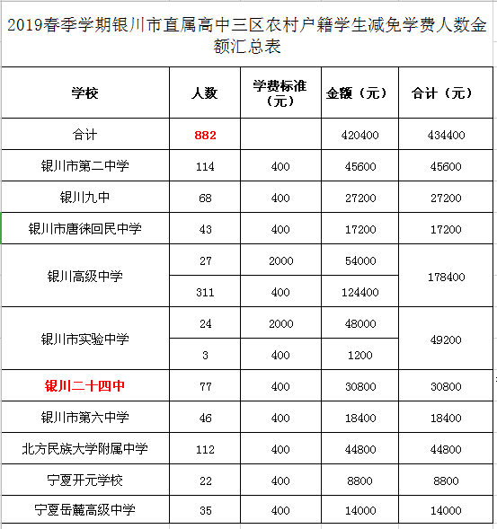 2019春季学期银川市直属高中三区农村户籍学生减免学费人数金额汇总表