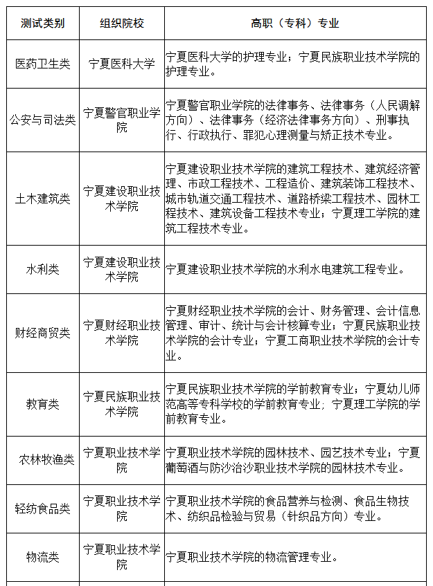 1.中等职业学校毕业生报考高等职业教育分类招生考试,实行“文化基础+职业技能”的评价办法。文化基础测试由宁夏教育考试院统一组织实施,测试科目为语文、数学、英语3科,满分300分,测试时间安排在4月17日至18日进行。