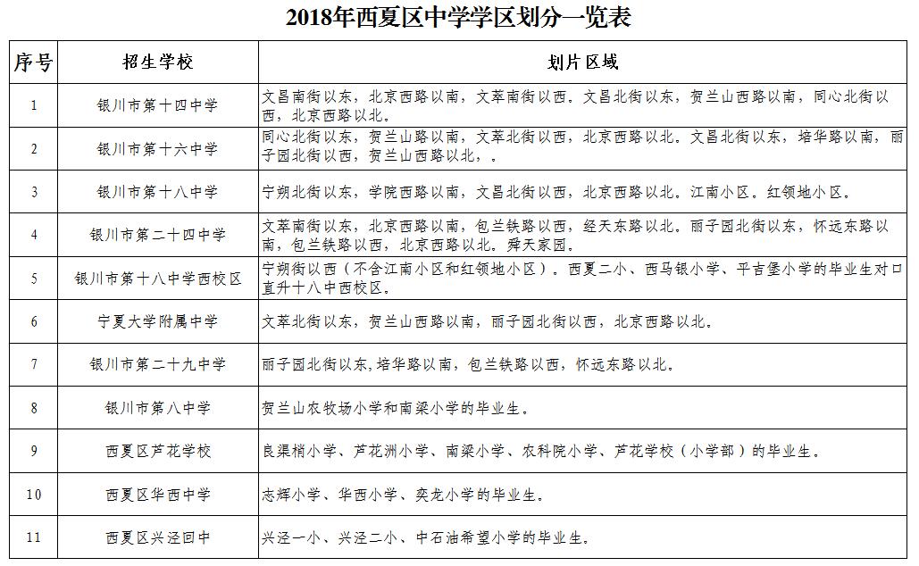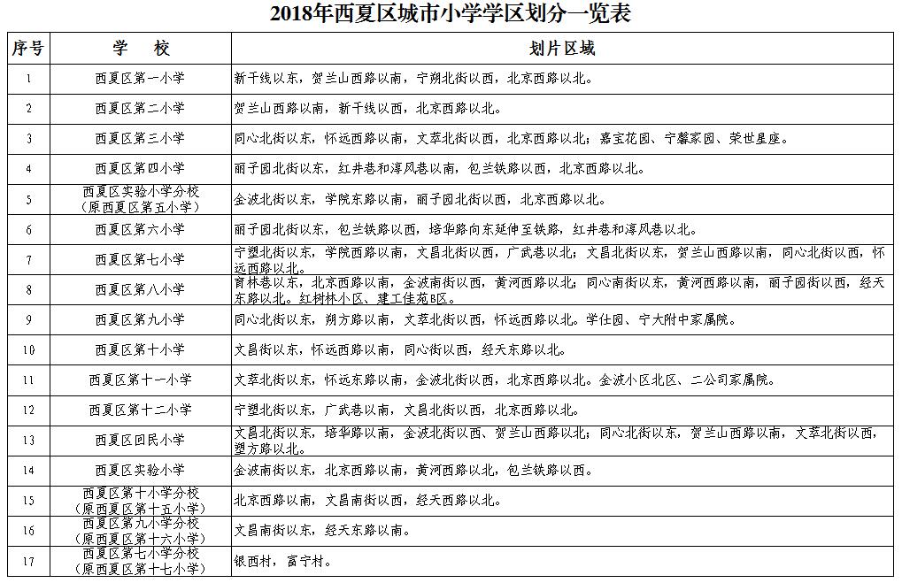 2018年西夏区城市中小学学区划分一览表