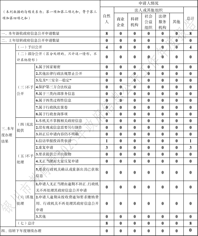 (二)依申请公开情况。全年受理政府信息公开申请8件,内容主要涉及历史文件查询等方面,其中予以公开4件,无法提供4件(均按要求说明理由),所有申请均已在法定期限内依法、规范办理完毕,未发生因政府信息公开工作引发的行政复议或行政诉讼。市教育局进一步完善了依申请公开流程,畅通了申请渠道,确保了公众依法获取政府信息的权利。