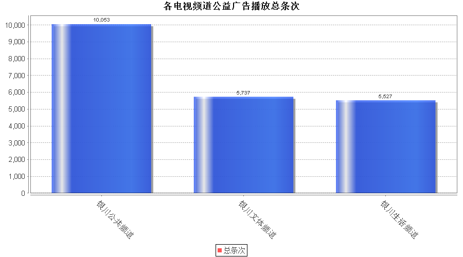 公益广告发布总条次数看,本次抽查的3个电视频道发布公益广告总条次数为21317,平均每个频道约7105.6条次,条次数高于平均值的电视频道有1个,其中银川公共频道最多,为10053条次,银川生活频道最少,为5527条次,两者相差4526条。