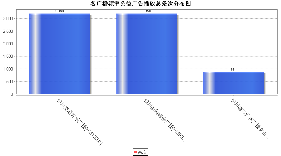 从公益广告发布总条次数看,本次抽查的3个广播频率发布公益广告总条次数为5651,平均每个频率约1883.6条次,条次数高于平均值的广播频率有1个,其中银川交通音乐广播(FM100.6)广播最多,为3195条次,银川都市经济广播女主播电台(FM95.0)最少,为881条次,两者相差2314条次。