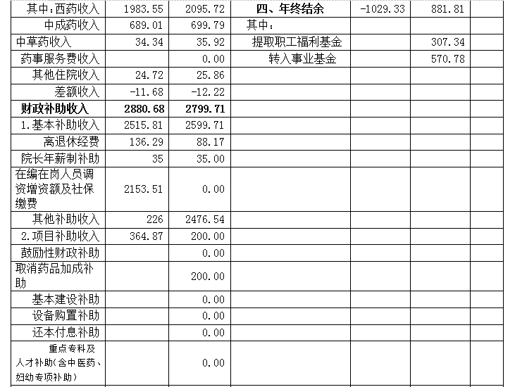 2、财政补助收入。2019年度财政补助收入按财政批复预算数2,799.71万元,其中:离退休人员经费88.17万元,院长年薪制财政补助资金35万元,薪酬总额财政补助资金2,471.74万元,公务员医疗补助4.8万元,取消药品加成财政补助资金200万元。