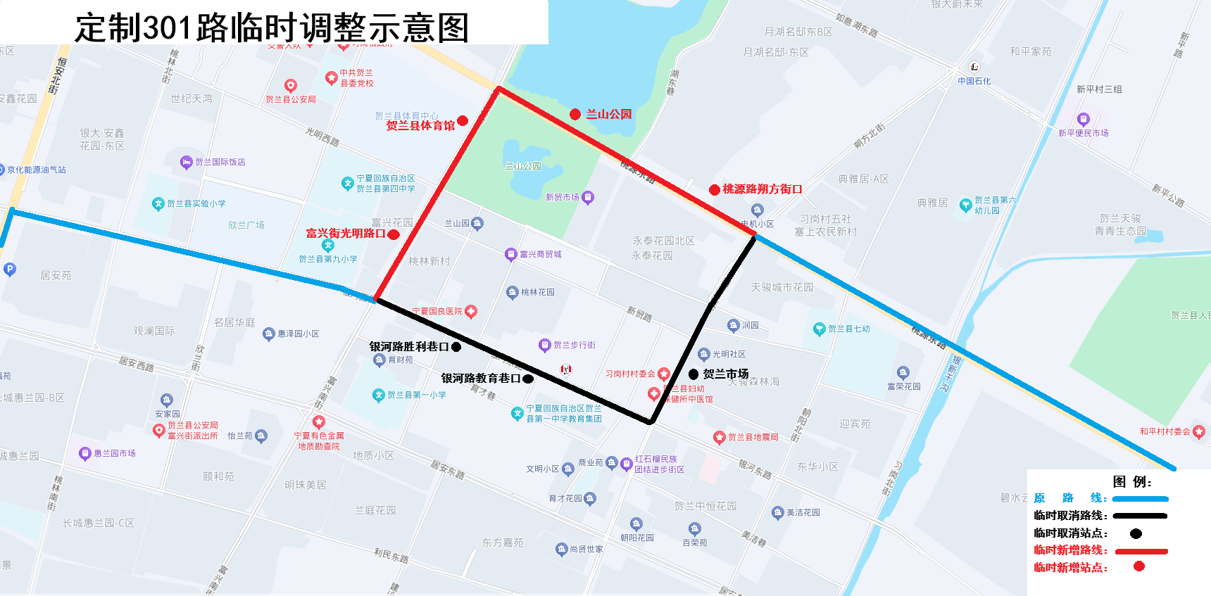 临时停靠4站:桃源路朔方街口、兰山公园、贺兰县体育馆、富兴街光明路口