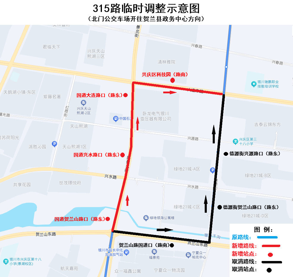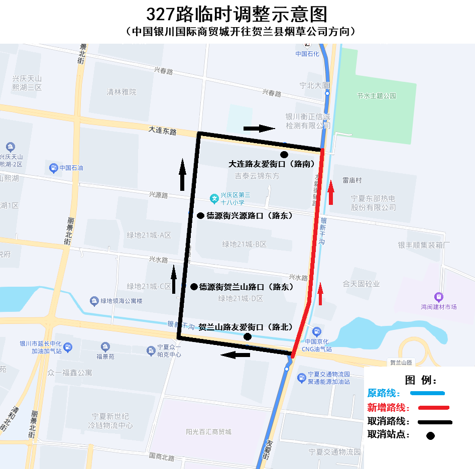 临时调整为:北门公交车场(始发)—上海路—丽景街—大连路—德源街—德鑫路—原路线—贺兰县政务中心(终点)。