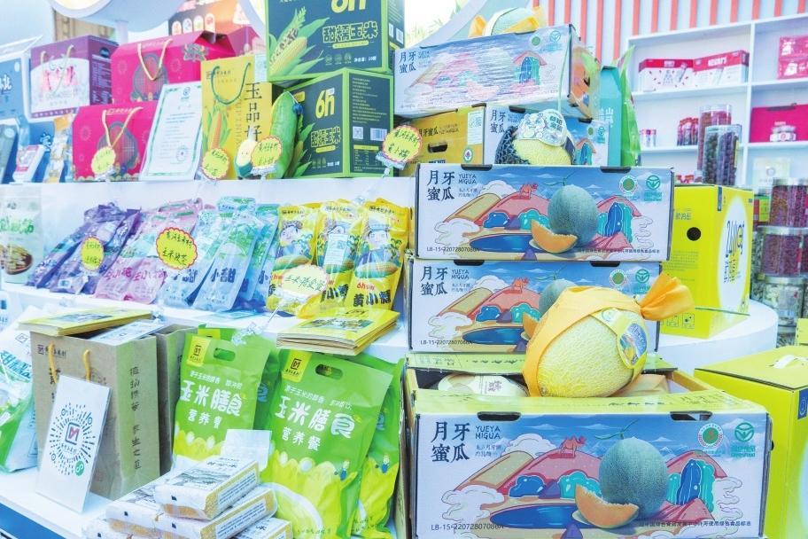 展会上展出的蜜瓜、玉米等绿色优质农产品