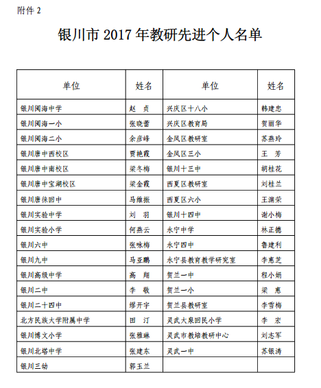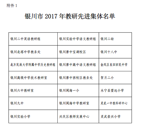 为深入推进全市教研工作,进一步加强教研队伍的管理与建设,银川市教育局在全市范围内开展了教研先进集体和先进个人的推荐评比活动。经过基层推荐、市教科所审核、市教育局研究,决定对银川二中英语教研组等21个教研先进集体,银川阅海中学赵贞等35名教研先进个人进行表彰。希望受表彰的集体(单位)和个人珍惜荣誉,再接再厉,进一步扎实有效地开展教研工作,促进教师专业发展,推动教学质量提升。