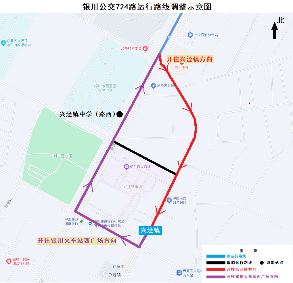 因西夏区兴泾镇集市日期间,市场周边道路通行条件复杂,为保障公交车辆运营安全及市民出行安全,银川市公共交通有限公司决定自2026年2月6日(星期五)起,对公交724路部分运行路线进行调整。具体事宜如下: