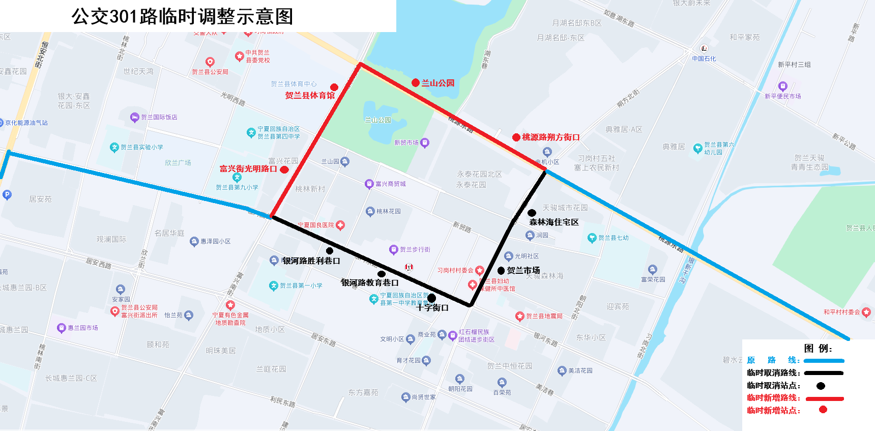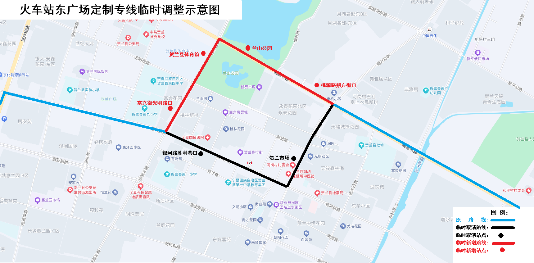 临时停靠4站:桃源路朔方街口、兰山公园、贺兰县体育馆、富兴街光明路口