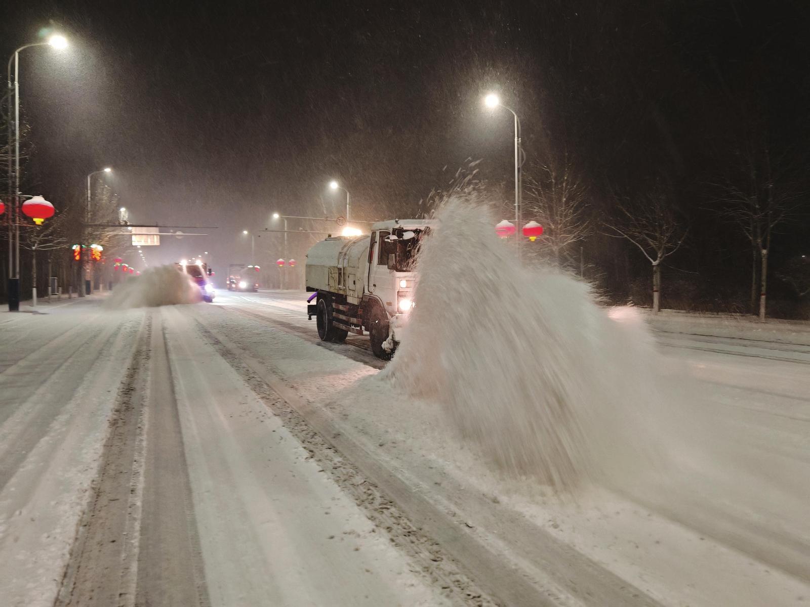 为及时清除道路积雪,1月25日凌晨3时30分,我市4700余名环卫工人准时到岗,集中清扫主要道路积雪。